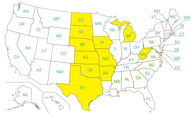 Currently looking for outside sales reps in the yellow highlighted states on map.
