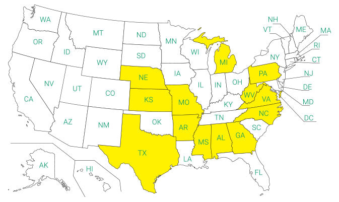 Currently looking for outside sales reps in the yellow highlighted states on map.